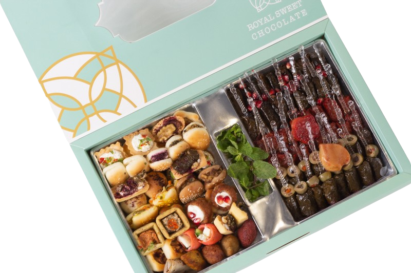 MOUTH WATERING MIXED FATHAYR ITEMS AND THREE KINDS OF VINE LEAVES ITEMS ARRANGED IN OUR BOX…
